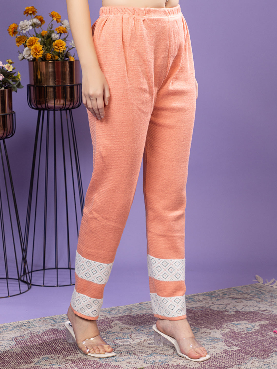 Elevate your winter wardrobe with this elegant women’s woolen kurta set with dupatta. Crafted in a soft pastel shade, the set features a beautifully embroidered kurta with intricate white patterns on the yoke and sleeves. Designed with a straight-cut silhouette and full sleeves, it ensures both warmth and style. The matching pants come with coordinated embroidery at the hem, while the textured woolen dupatta completes the sophisticated look. Perfect for festive occasions, family gatherings, or casual outings, this outfit blends comfort with timeless ethnic charm.
